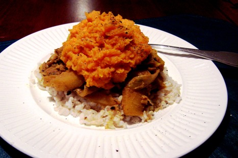 Presented on a bed of brown rice, then topped with mashed sweet potatoes that have been spiked with a touch of maple syrup and vegan butter, this is an unconventional but very tasty dish.