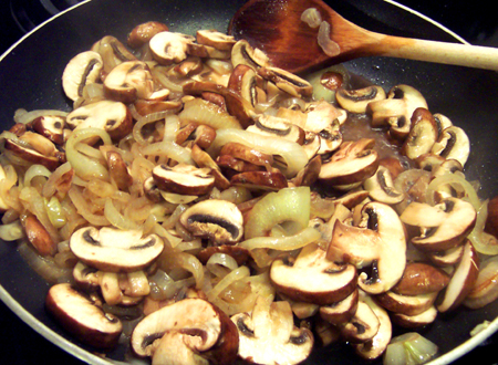 Sautee the onions in the oil on medium-low heat slowly until they are just starting to soften. Then add the sliced mushrooms and cook, stirring frequently, until the mushrooms are nicely browned and the onions caramelized. The liquid from the mushrooms should have evapourated. Remove from heat.